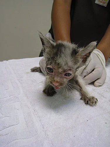 結果打開來 , 看到一隻全身髒兮兮滿身跳蚤 眼睛發炎到都看不到眼睛的小貓