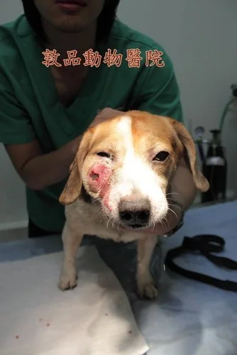 前陣子這隻米格魯狗狗 , 臉腫了好大 , 臉上也破了一個洞